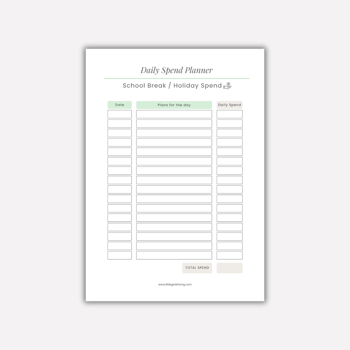 The Daily Spend Planner helps you plan your days and keep your spending on track. Having the kids at home can be expensive, and costs creep up fast. This page helps you stay mindful of your daily spend so you can enjoy the break without the stress of blowing the budget.