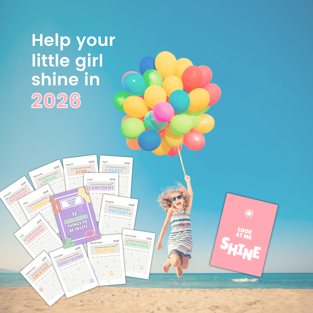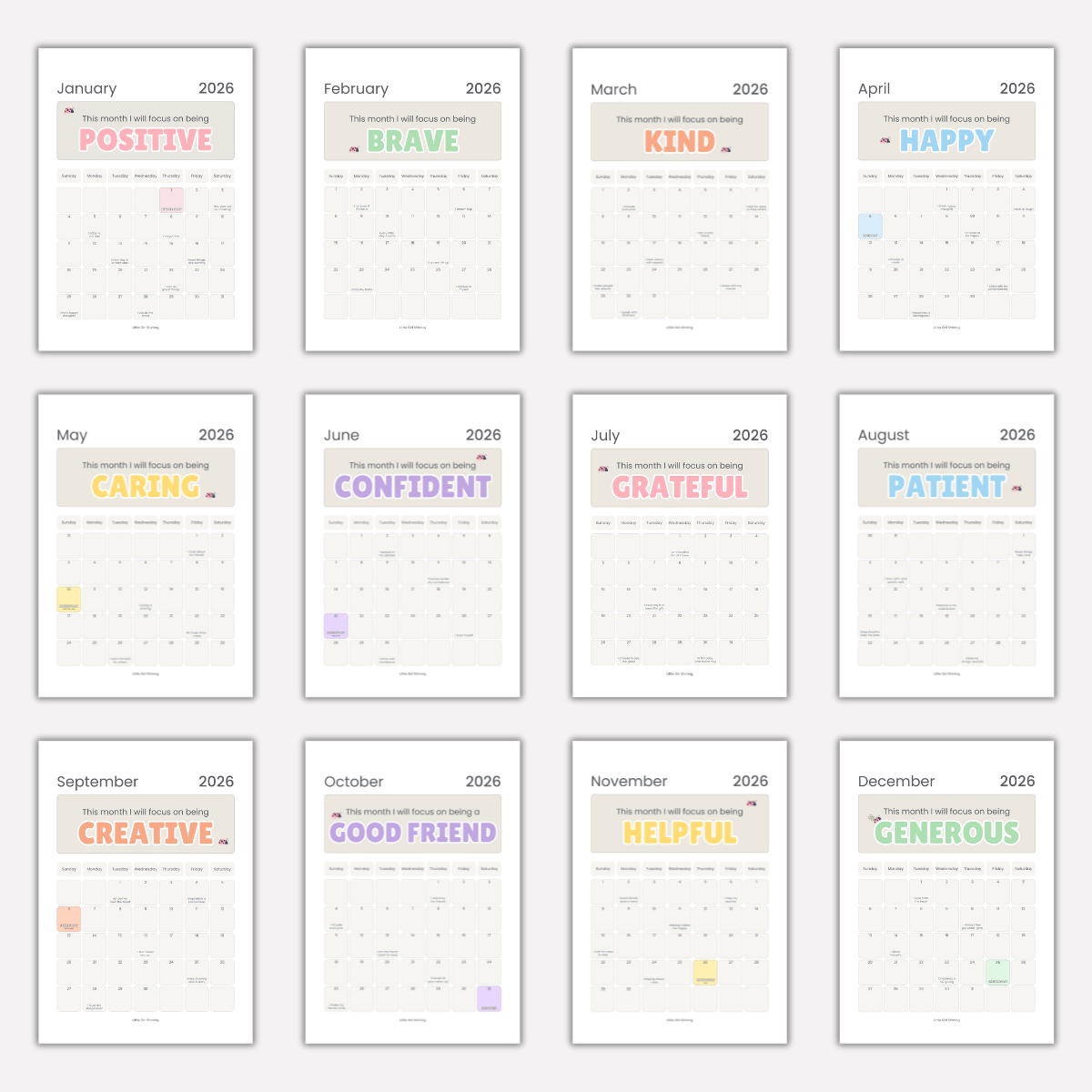Make 2026 the year your little girl shines! This inspirational printable calendar highlights 12 amazing qualities for her to grow and aspire to all year long.